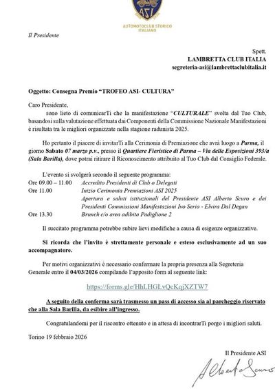 The prize will be formally received on March 7, 2026 in Parma by Giorgio Dalle Nogare, ASI Relations Delegate, representing Lambretta Club d’Italia